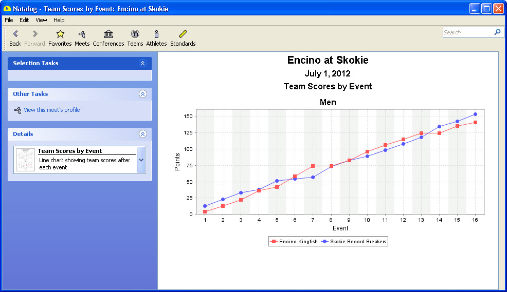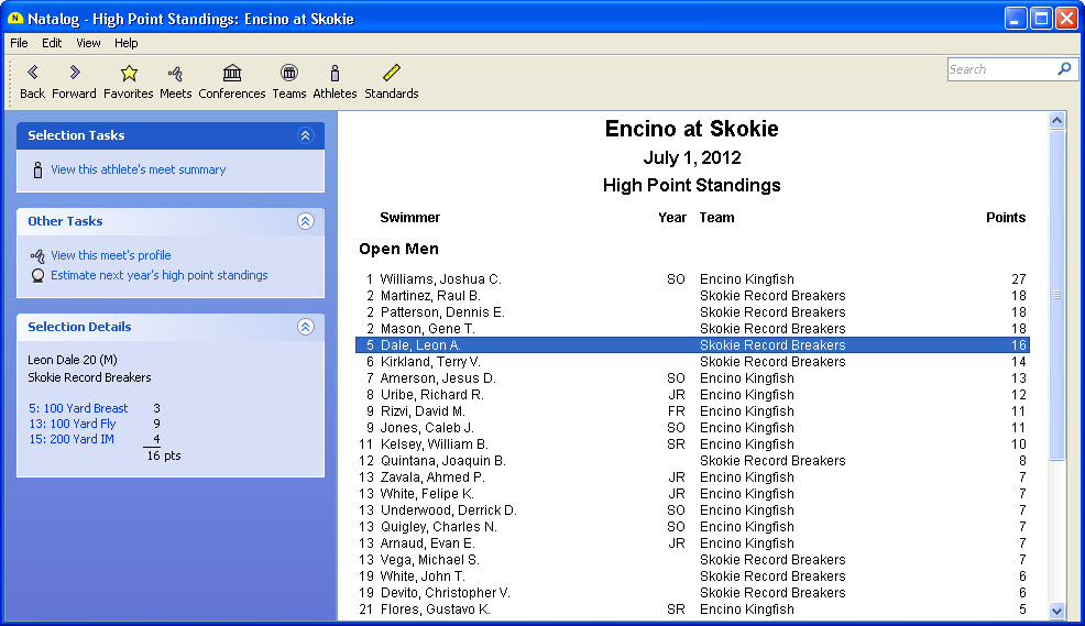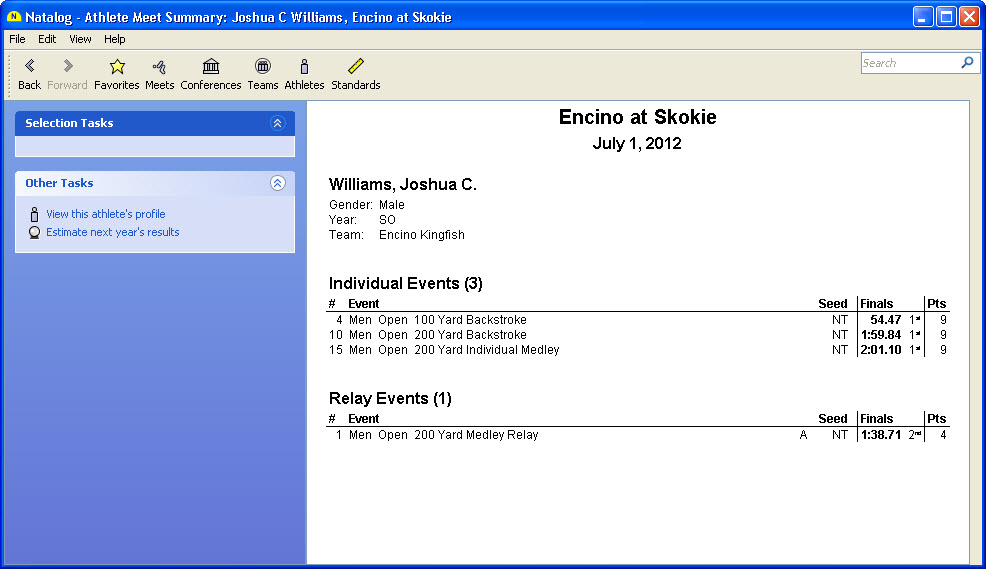 Estimate next year's meet results with a single click of the mouse. Score out a meet with teams or athletes performing better, worse, as seeded, or lifetime bests. See what happens if meets and/or teams are combined. These are all what-if scenarios that you can do with Natalog's simulations.