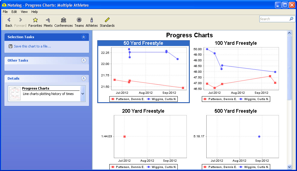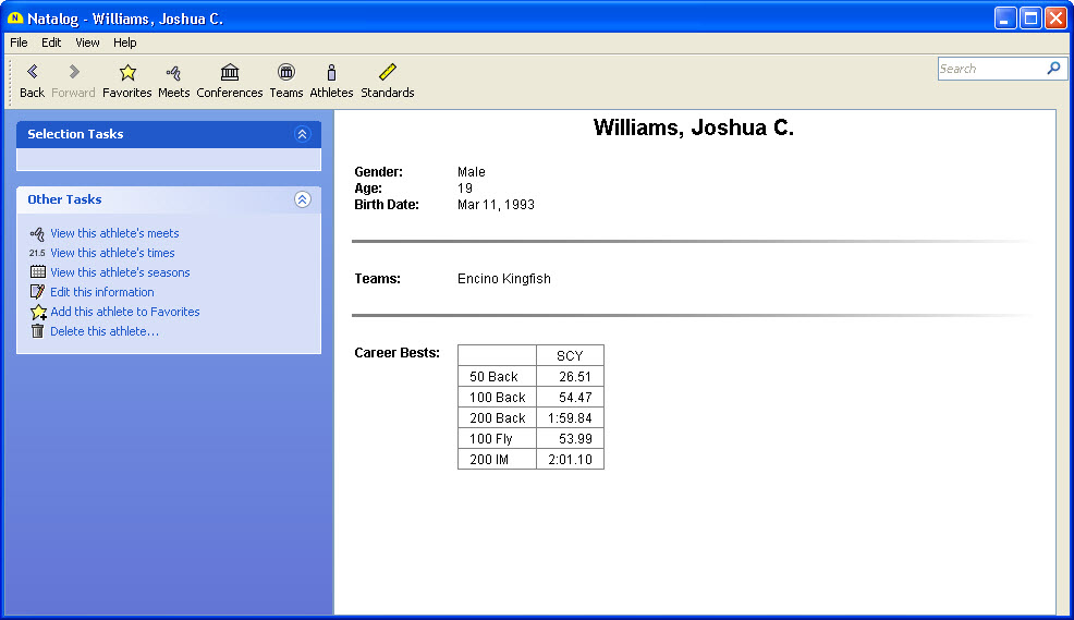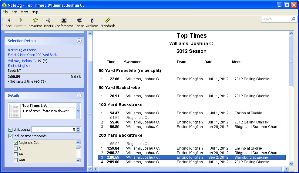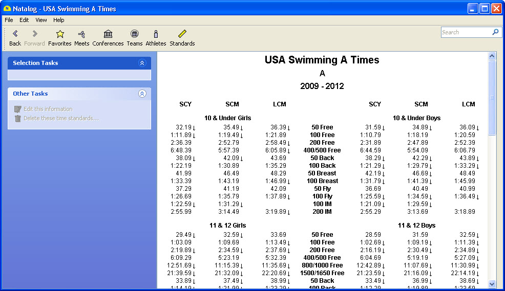 View top times lists for athletes, teams, conferences, meets, pools, or nations. List times from both meets and practices. Compare them to time standards or chart them. Fix inconsistencies by merging duplicate athletes and teams or by correcting splits.
