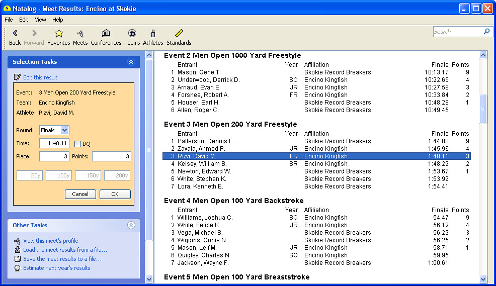 Drag and drop meet files into Natalog or hand-enter select results. Your meets can contain swimming, diving, open water, track, and cross country events. Seventeen file types are supported.