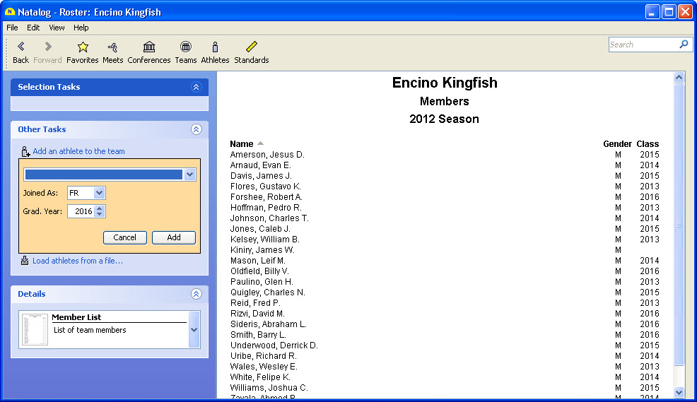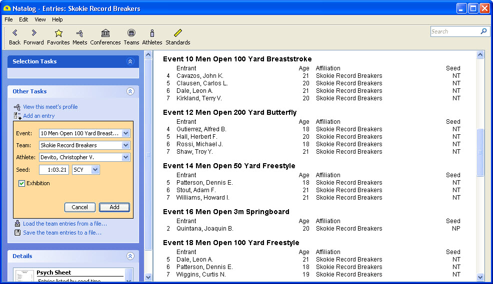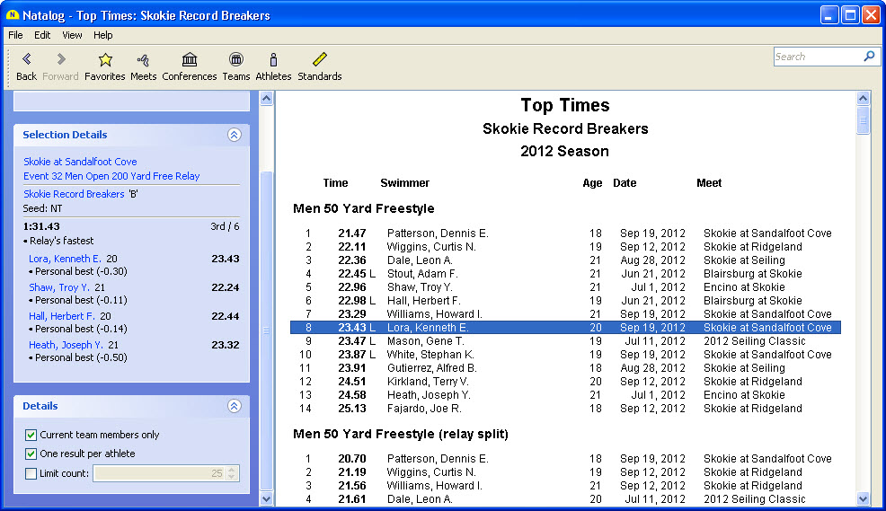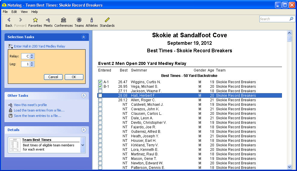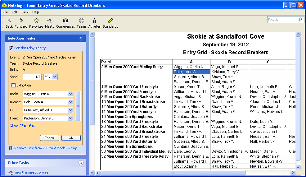 Load a meet set-up file and enter your athletes in their events. Then save your entries as a file to send to the meet host. Natalog helps you form relays by ranking relay combinations.