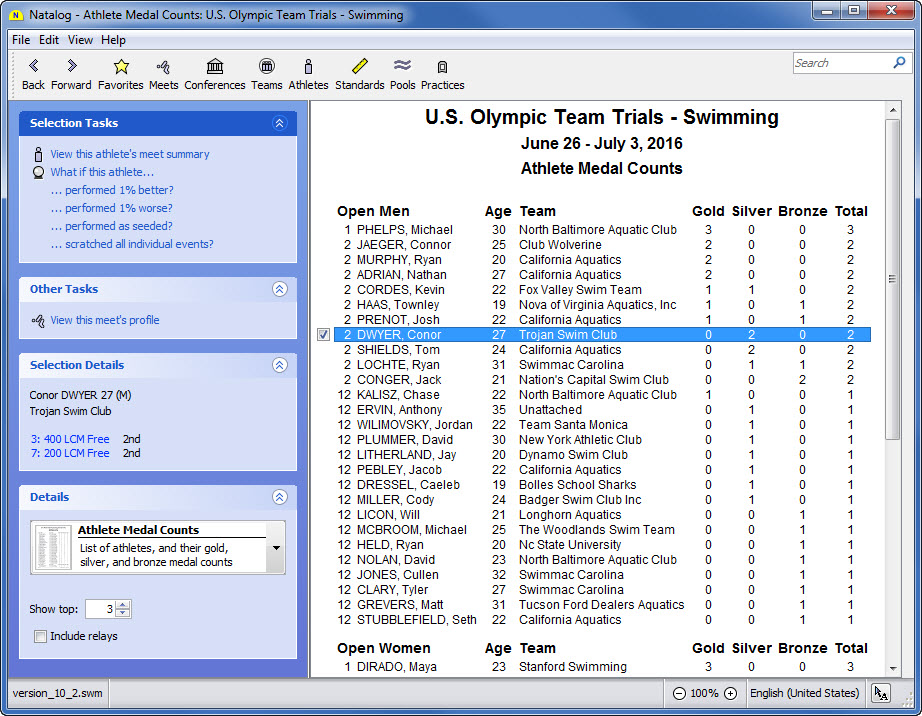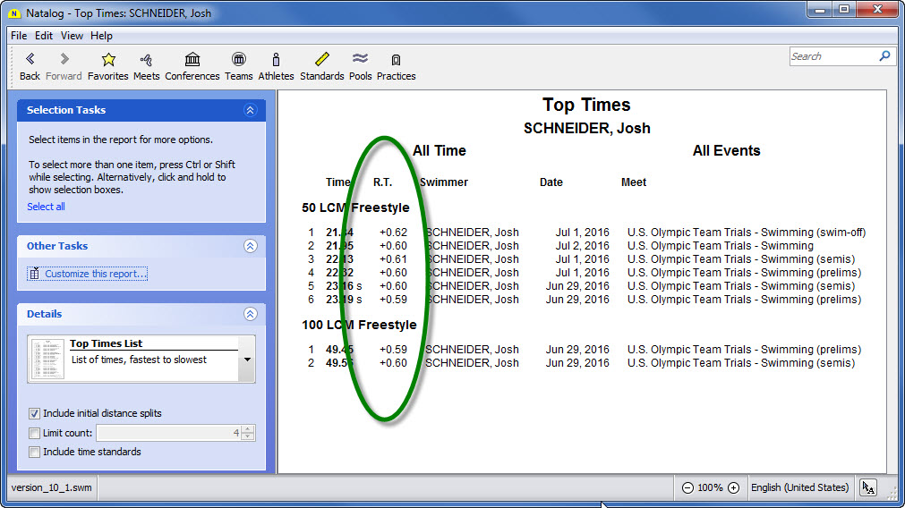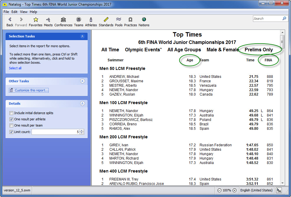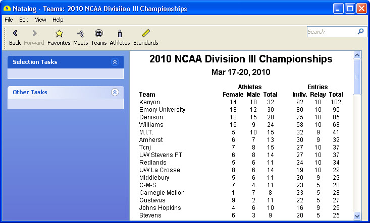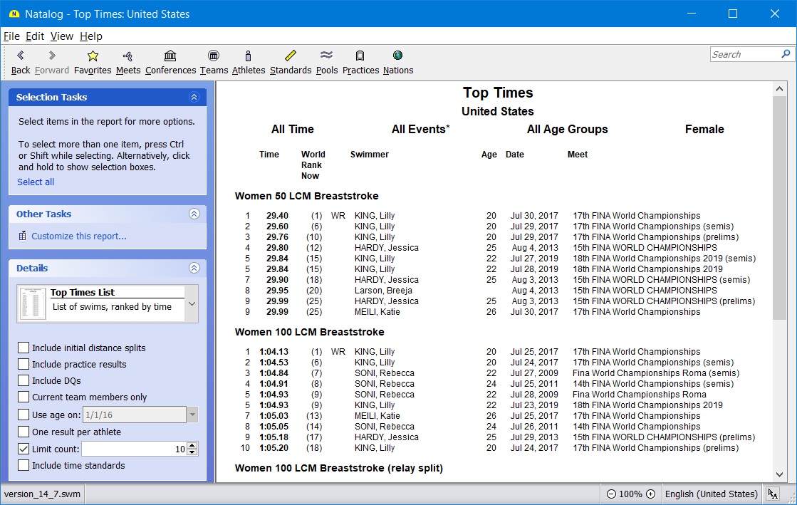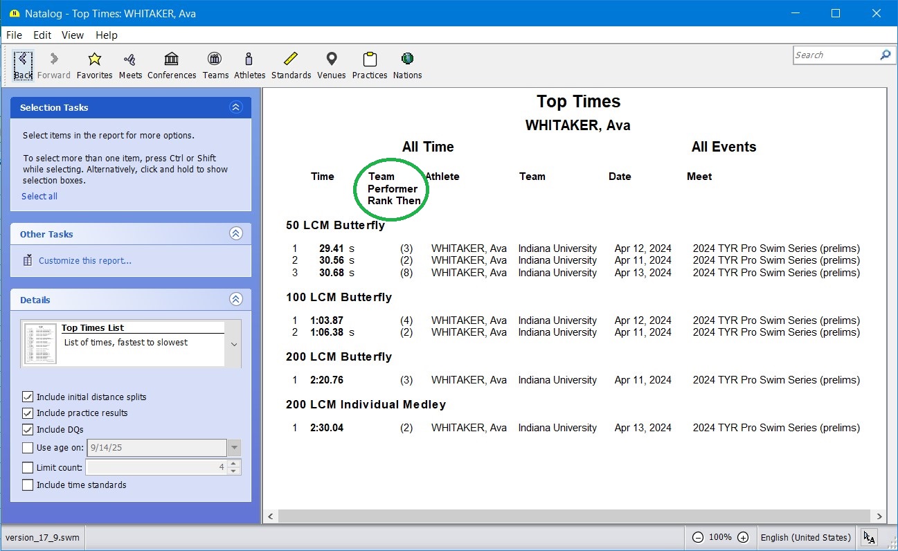 - Team, conference, pool, national, and world performer rankings (based on your loaded results) are now available as columns on the top times page