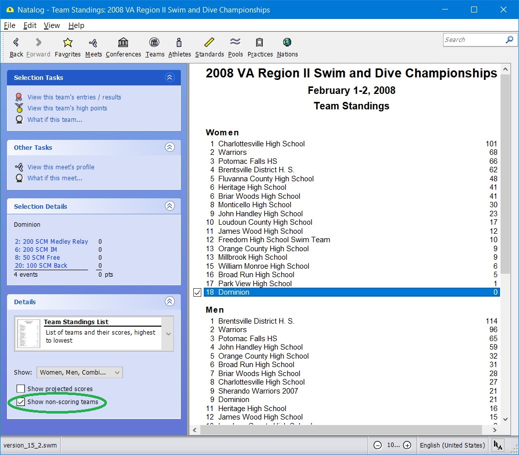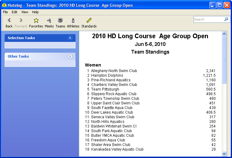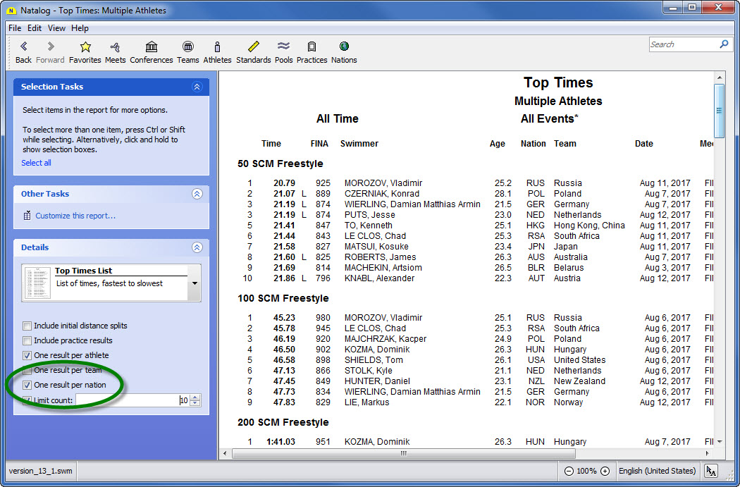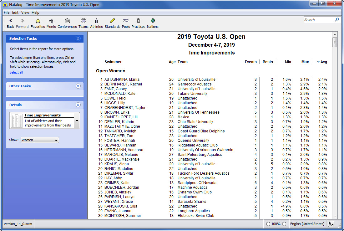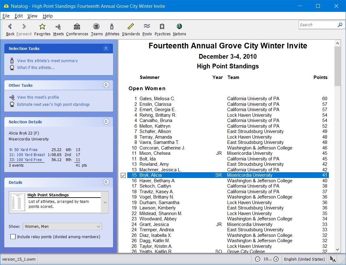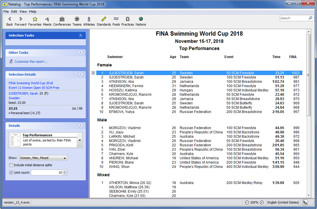 - Team, conference, pool, national, and world performer rankings (based on your loaded results) are now available as columns on the top times page