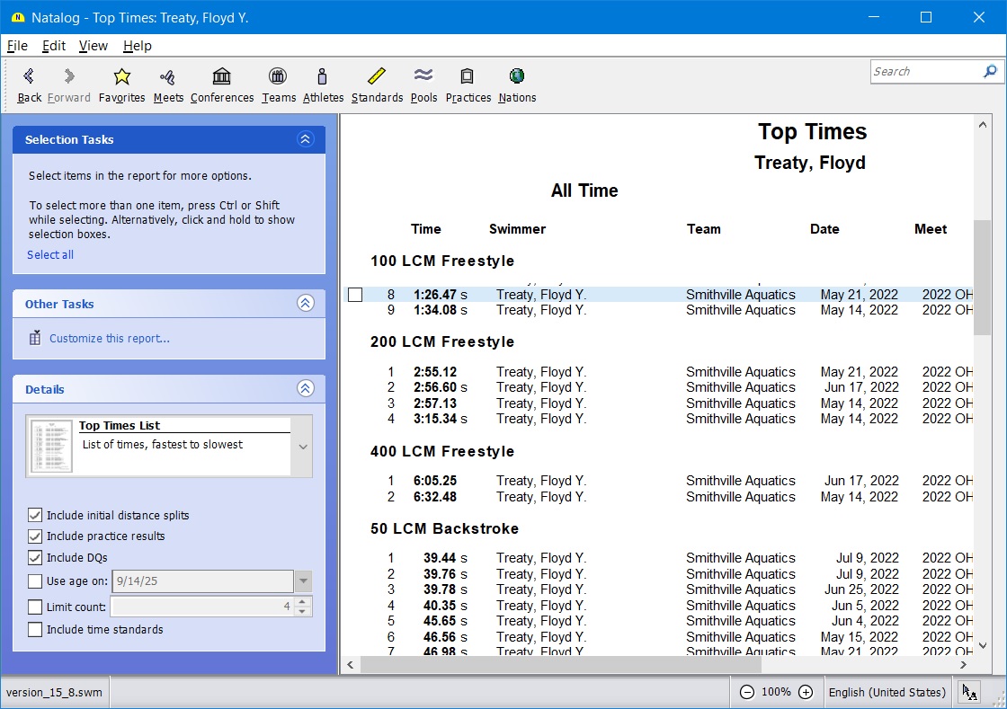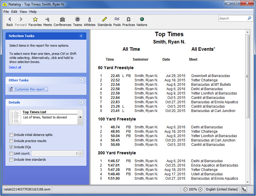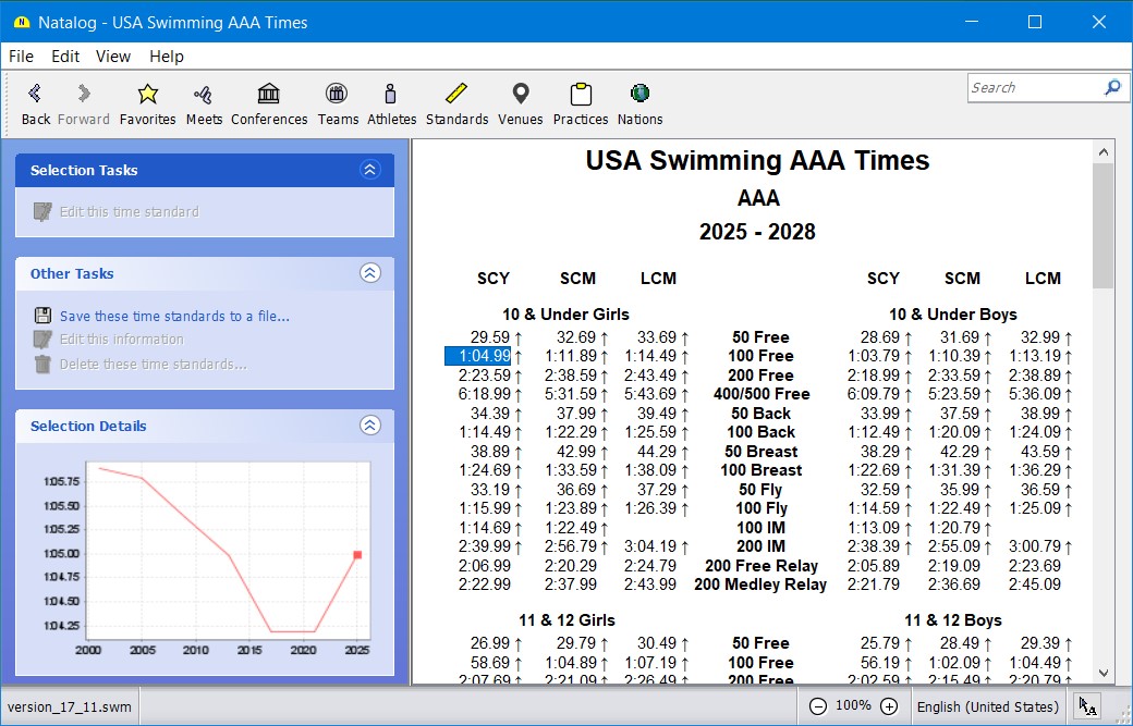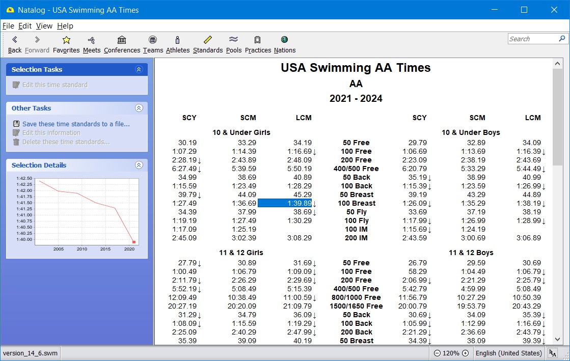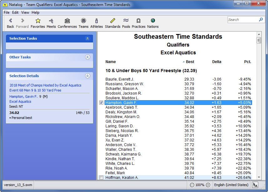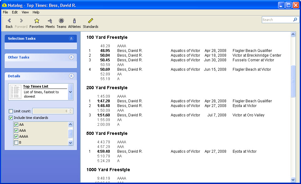 - Ability to choose the time standards to show with a swimmer's top times