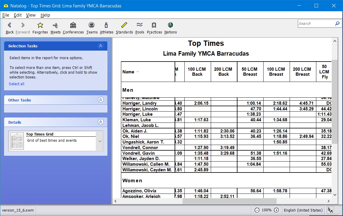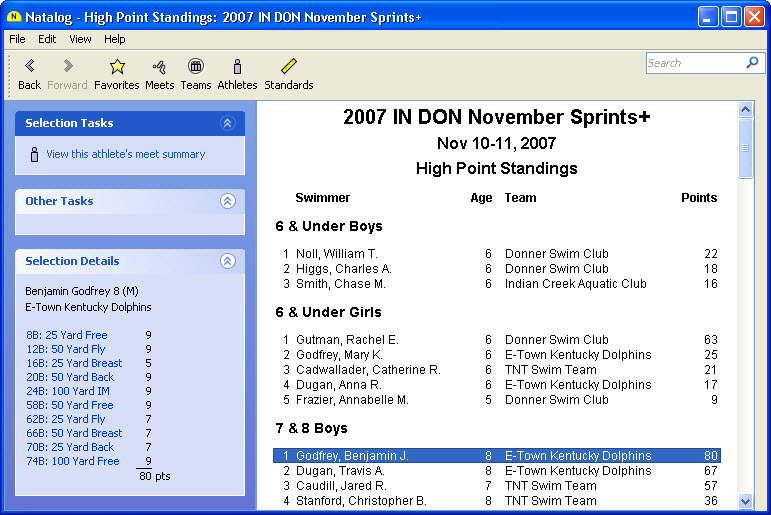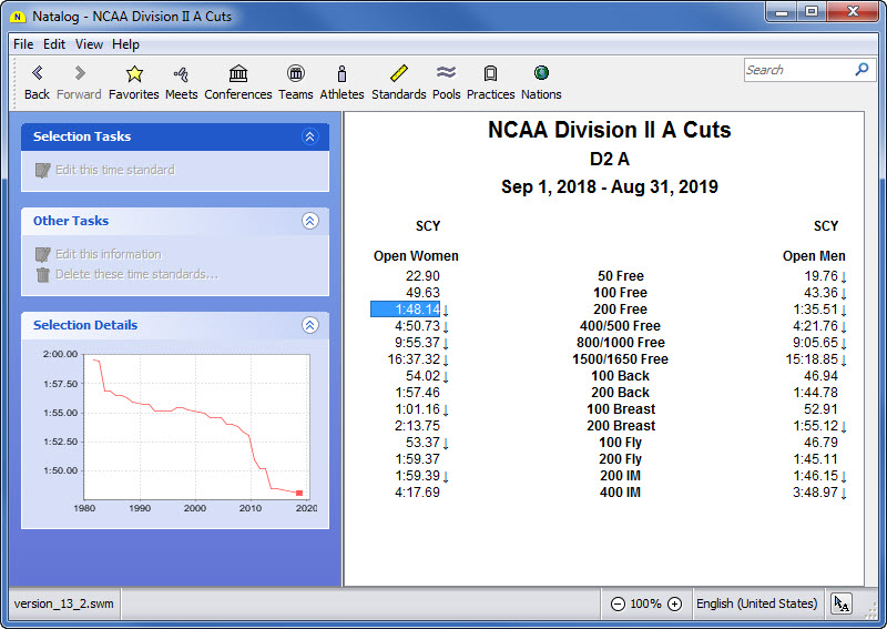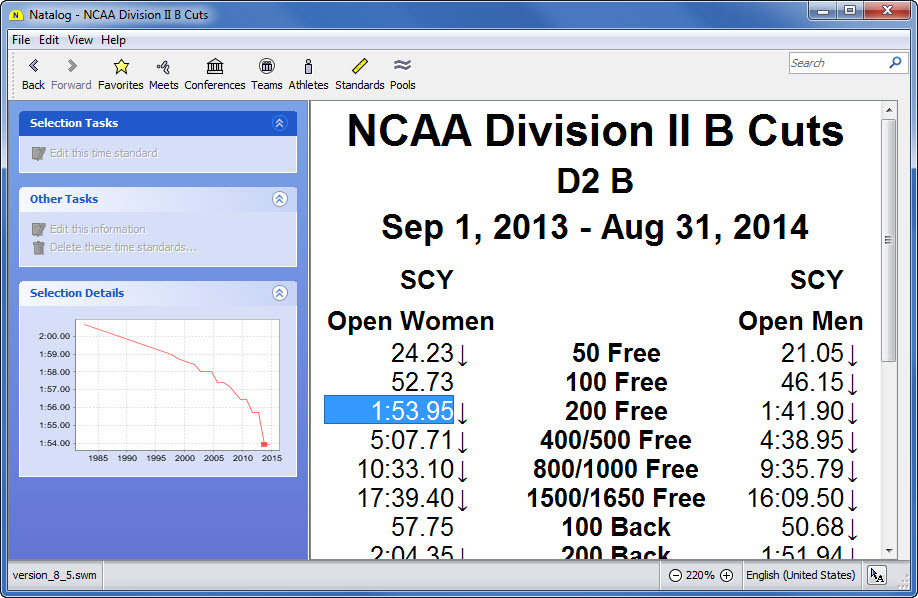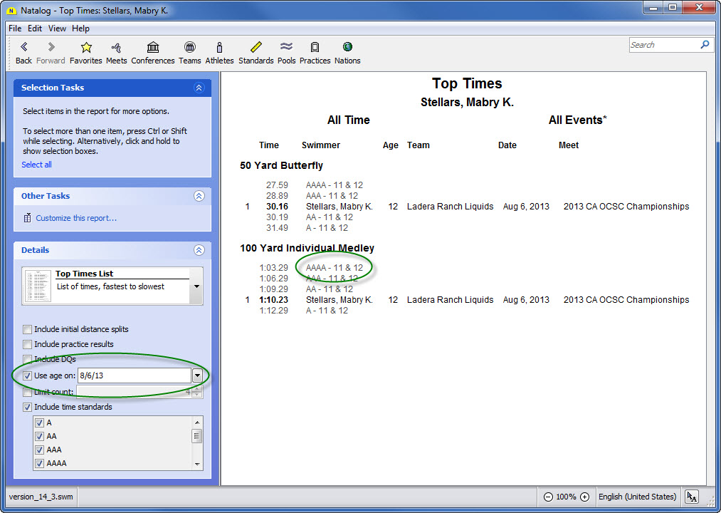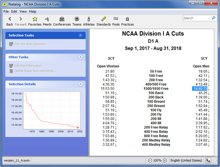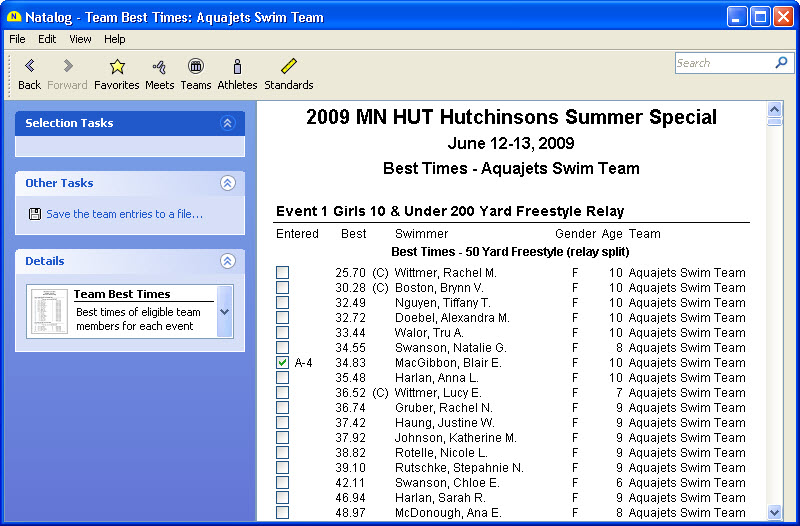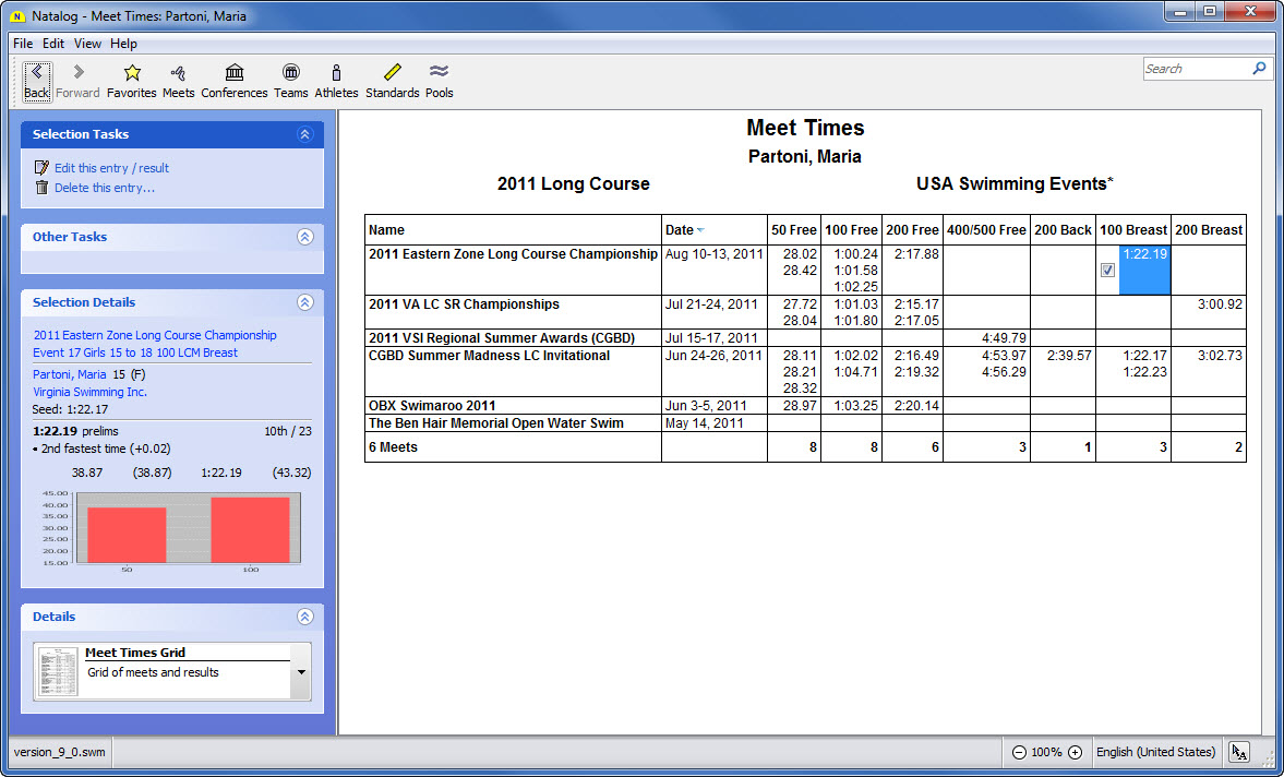 - Ability to choose the time standards to show with a swimmer's top times