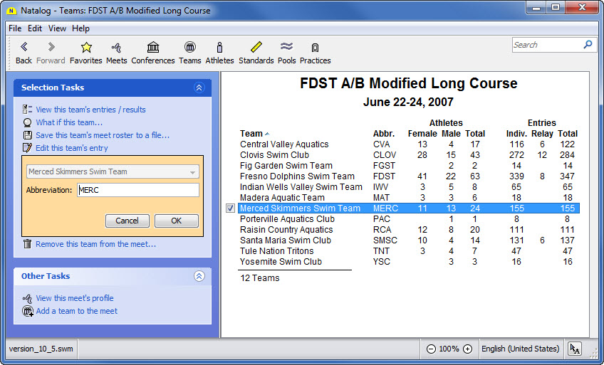 - Page showing the teams in a meet, their athlete counts, and their entry counts