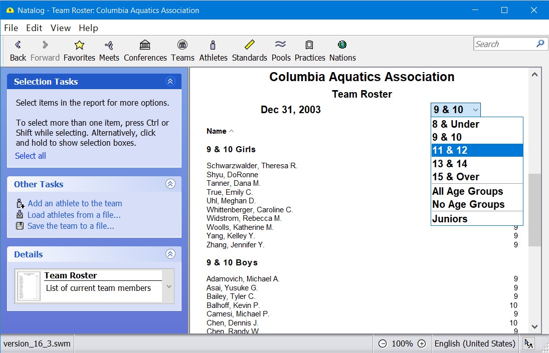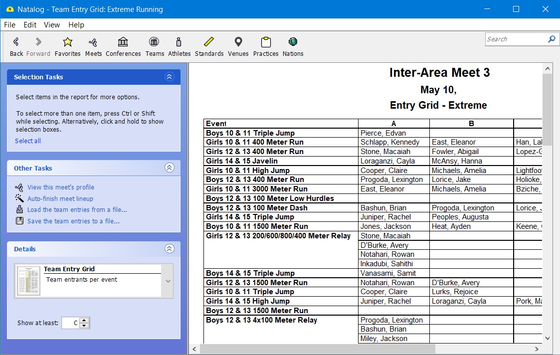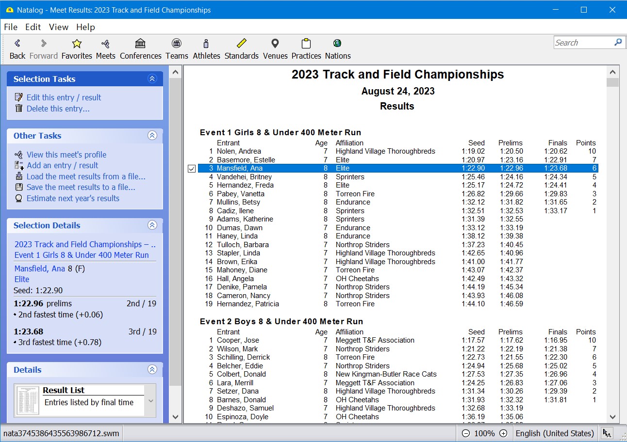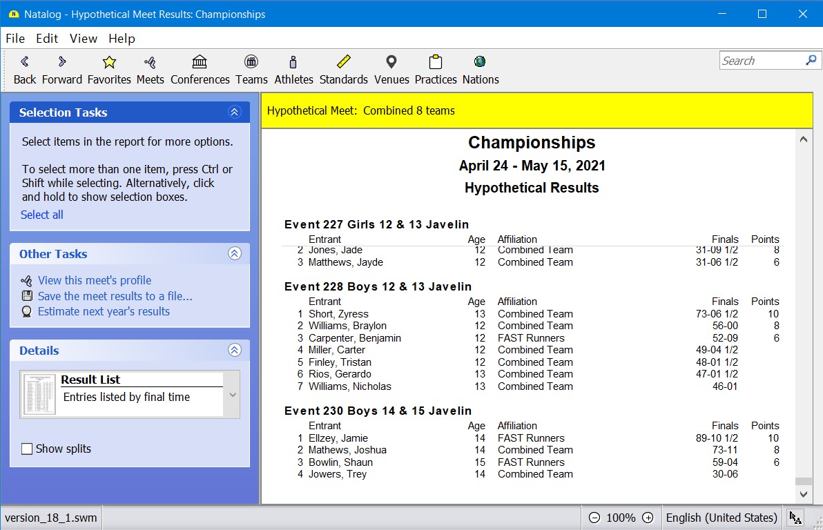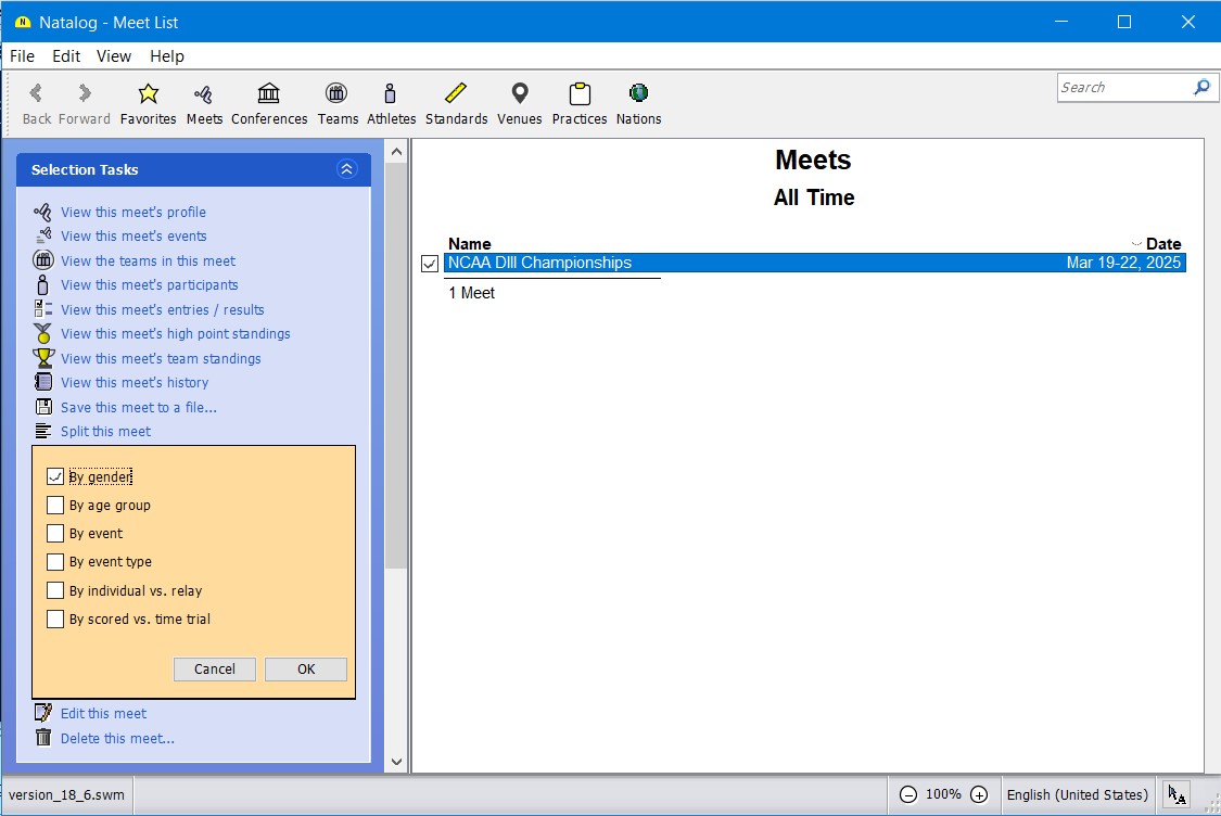 - Ability to split meets into smaller meets based on age group, gender, or event