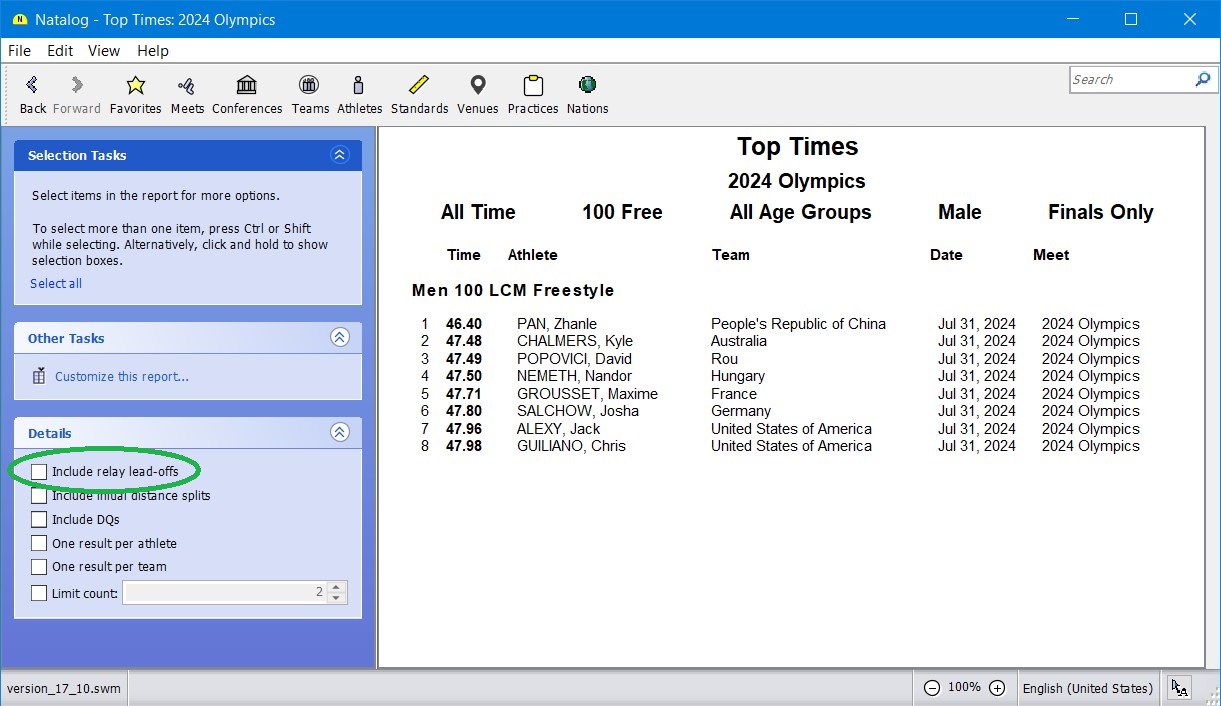 - New option on top times pages to exclude relay lead-offs