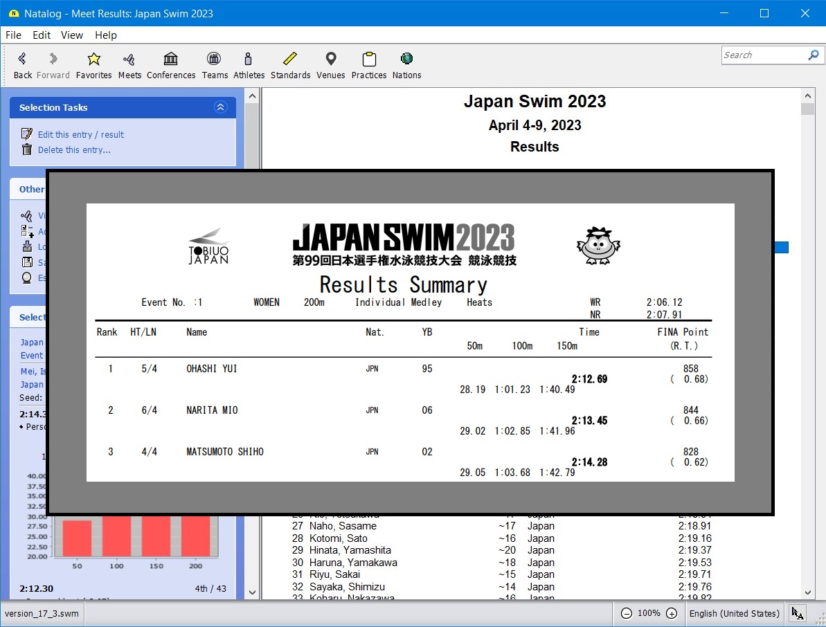 - Meet results report