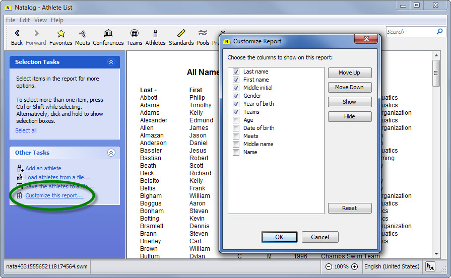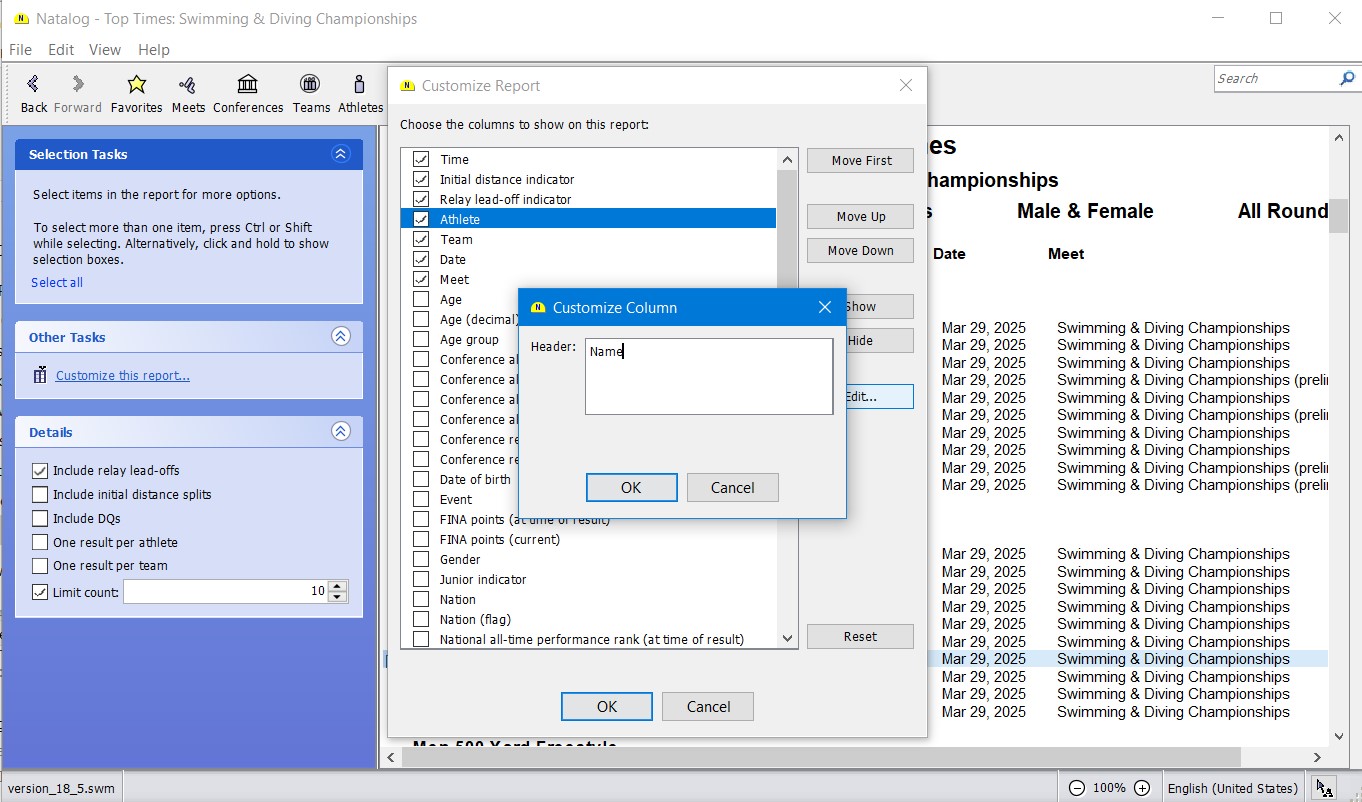 - Ability to customize column headers on top times, athlete, and team lists