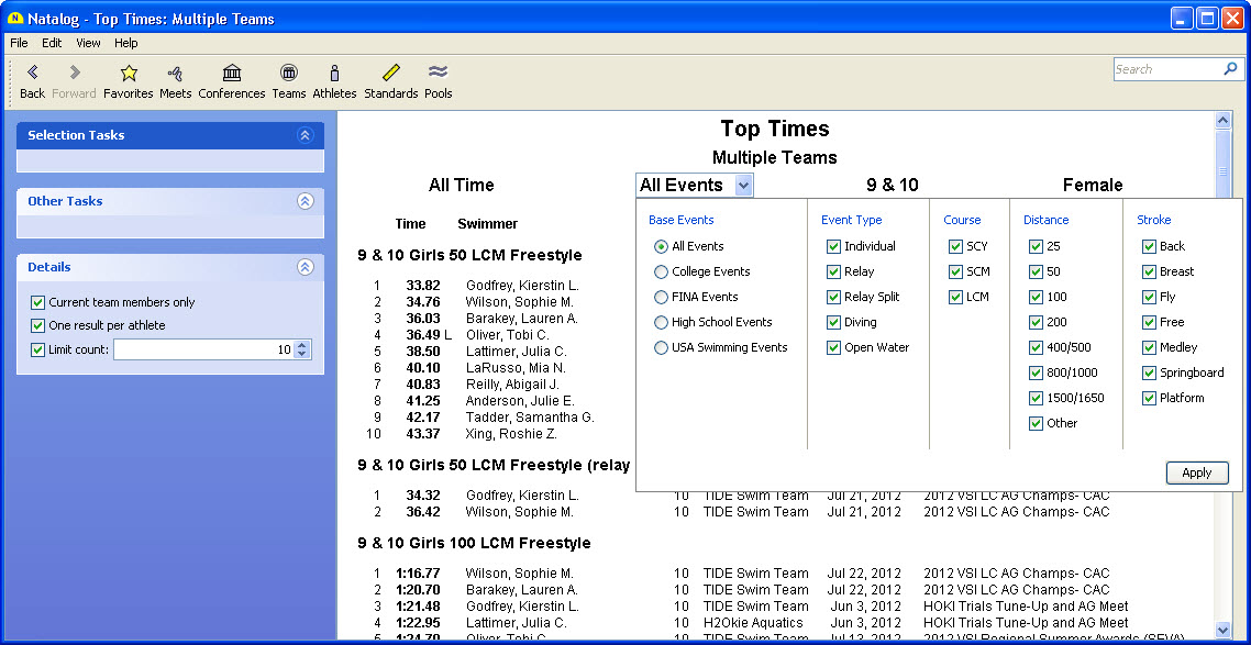 - Ability to show top times for a selected group of teams