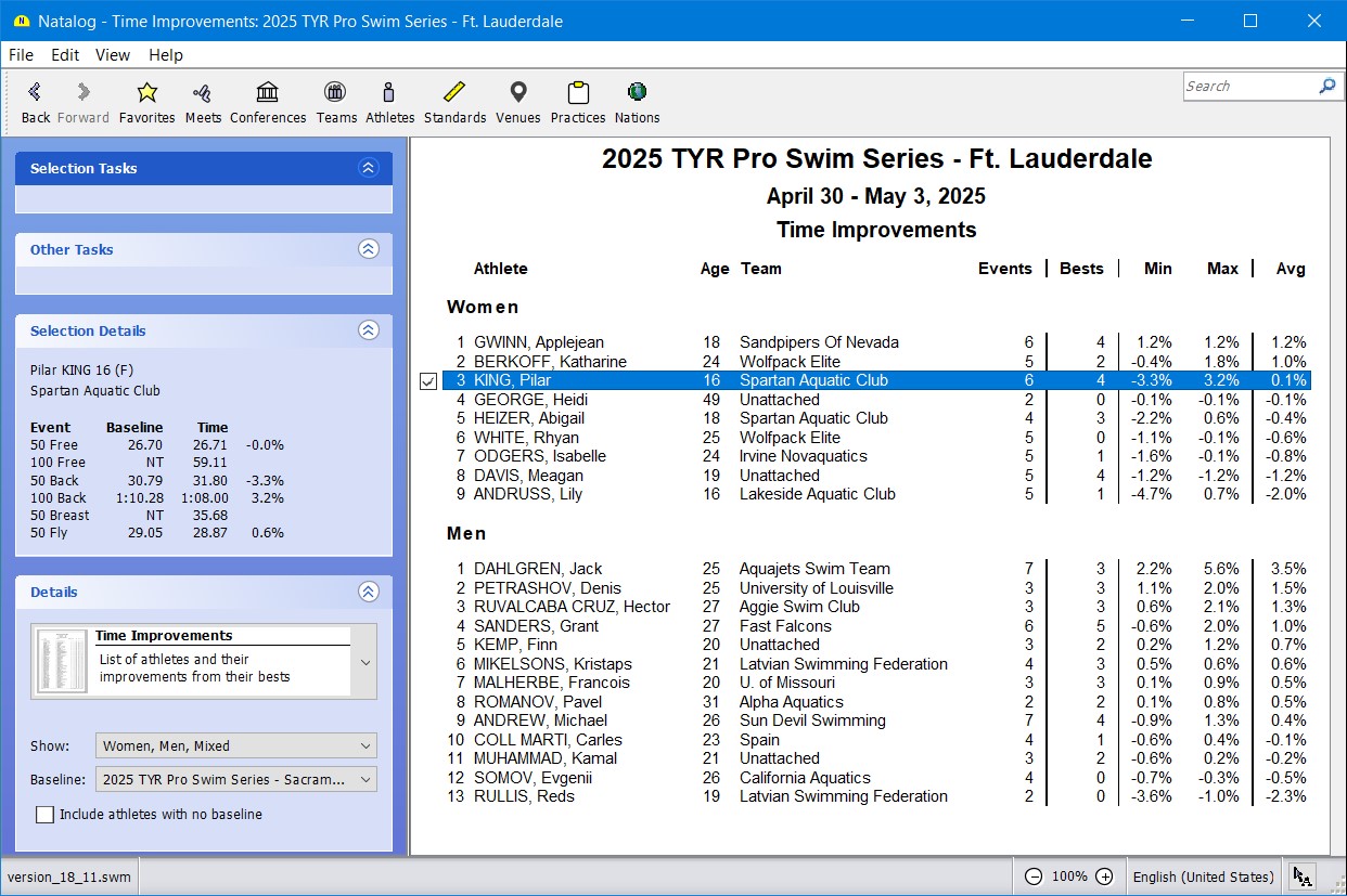 - Ability to choose the time standards to show with a swimmer's top times